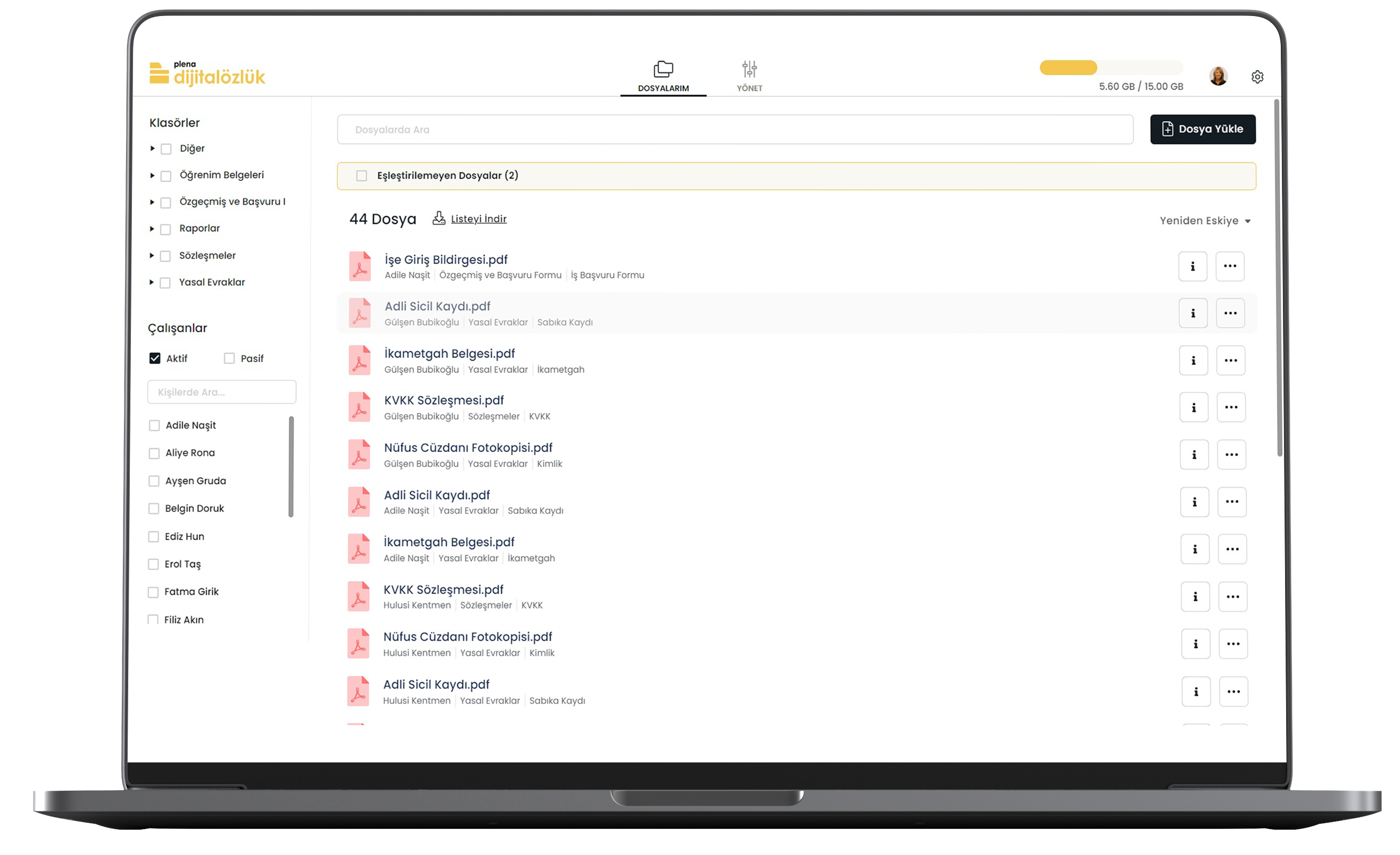 Çalışanlarınıza ait tüm belgeleri hızla tarayın ve sisteme yükleyin. Plena Dijital Özlük, dosyalarınızı otomatik olarak ilgili çalışan klasörlerine yerleştirerek size zaman kazandırır ve işlem kolaylığı sunar!