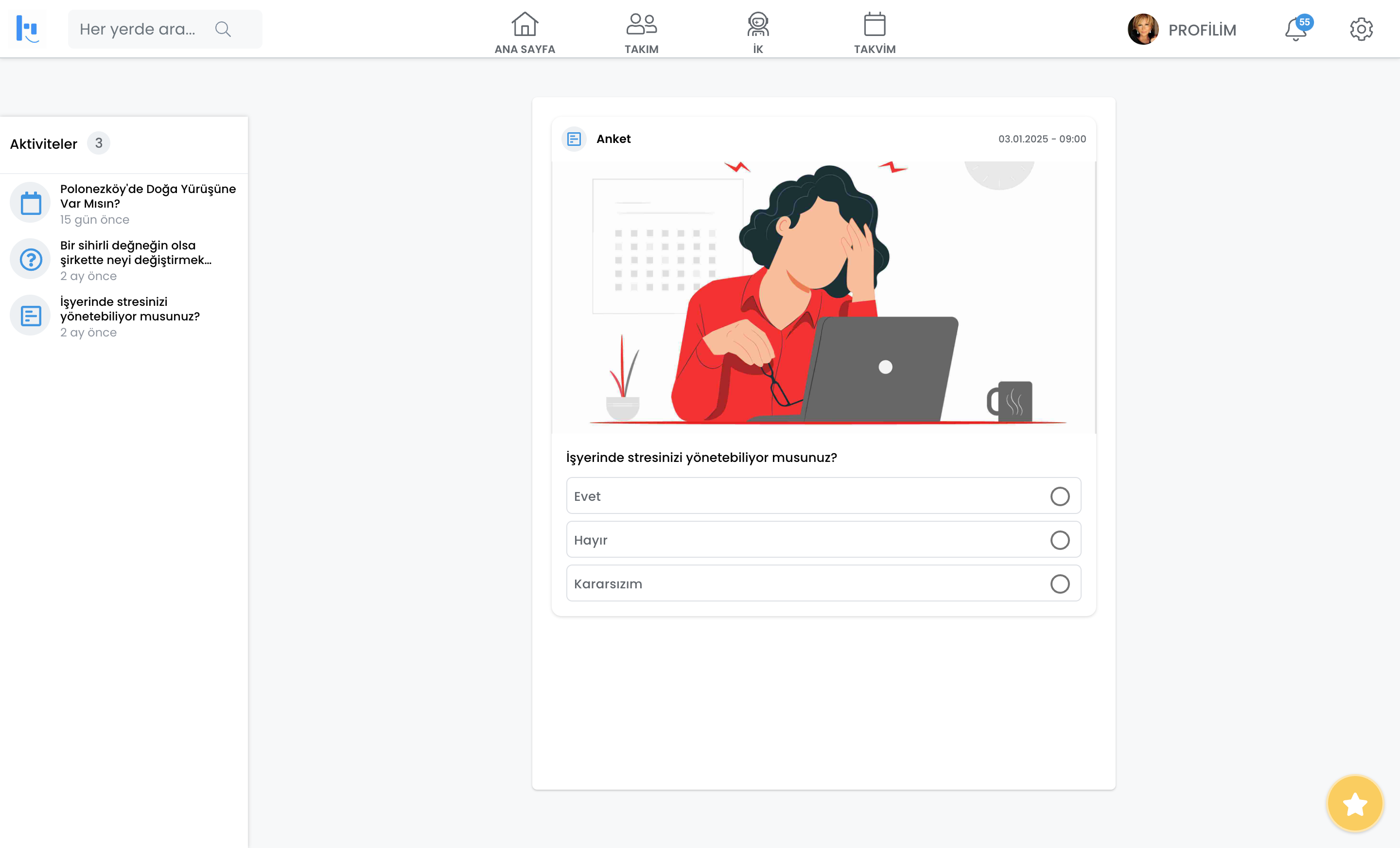Çalışanlarınıza belirli konular hakkında anketler oluşturun ve sonuçları anlık olarak görüntüleyin. Genel sorular sorarak çalışanlarınızın görüşlerini alın ve kurumsal iletişimi güçlendirin.