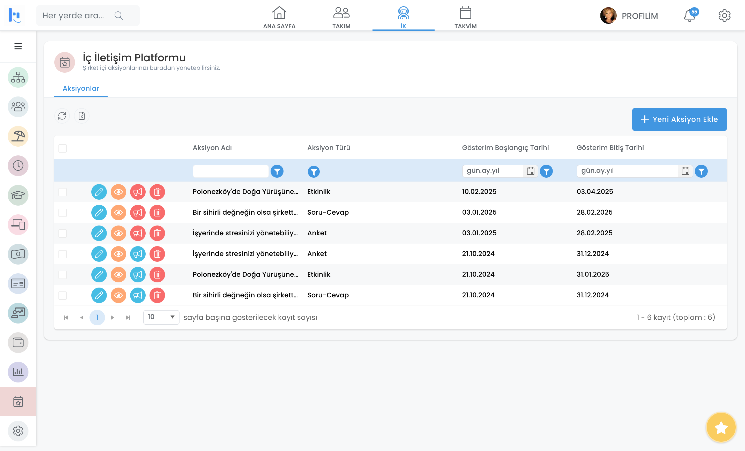 Aksiyonları ve Takvim Üzerinden Süreçleri Takip Edin