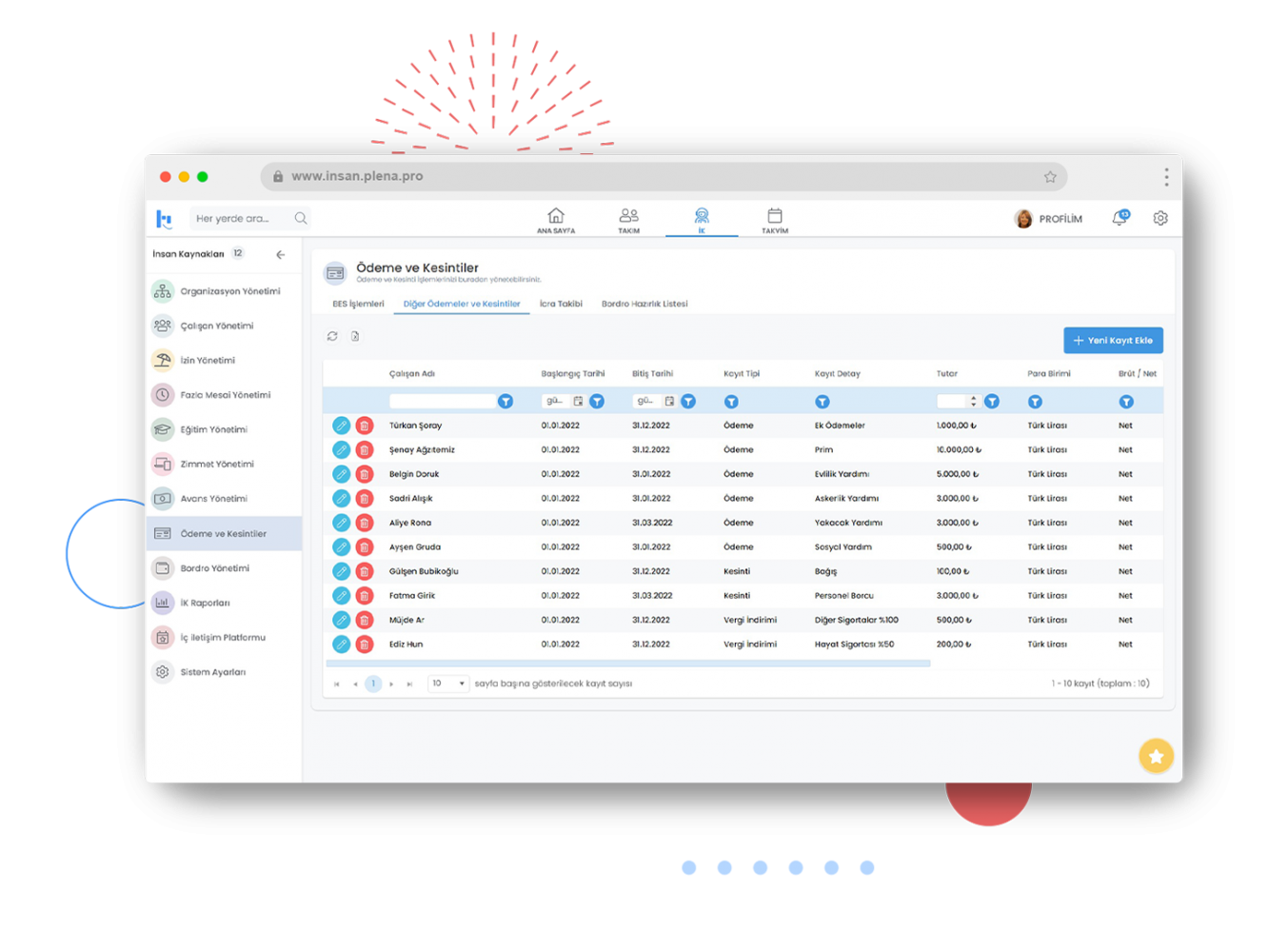 Bireysel emeklilik, icra ve diğer kesinti süreçlerinizi kolayca yönetin. Çalışanlarınıza ücret dışında yapılan ödemeleri kayıt altına alın ve bordro hesaplamaları için gerekli tüm verileri tek bir sistem üzerinden takip edin.