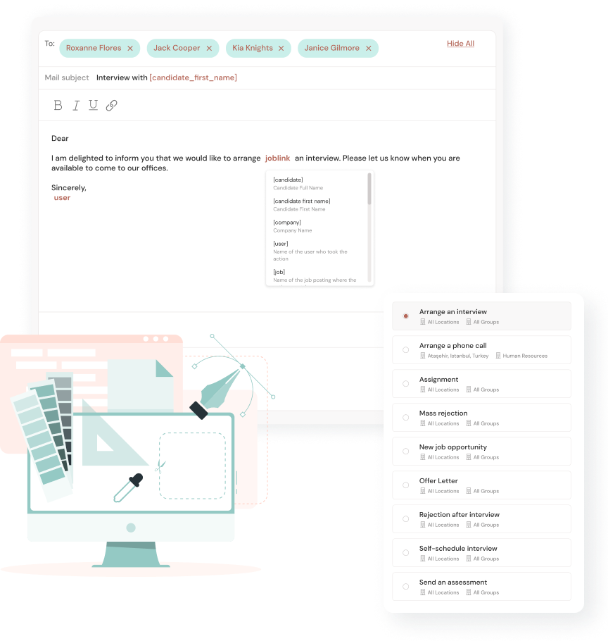 Her işe alım aşaması için hazır, özelleştirilebilir e-posta şablonlarımızı kullanarak aday etkileşimini kişiselleştirilmiş teşekkür notları ile yükseltin.